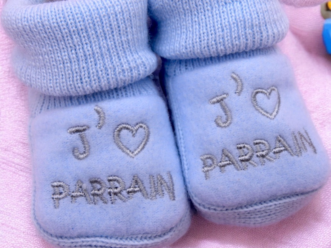Chaussons Bébé - Taille 0-6 Mois - J'aime Parrain - Brodés Naissance Layette - Annonce Grossesse - Baptêmes - Filleul - Filleule