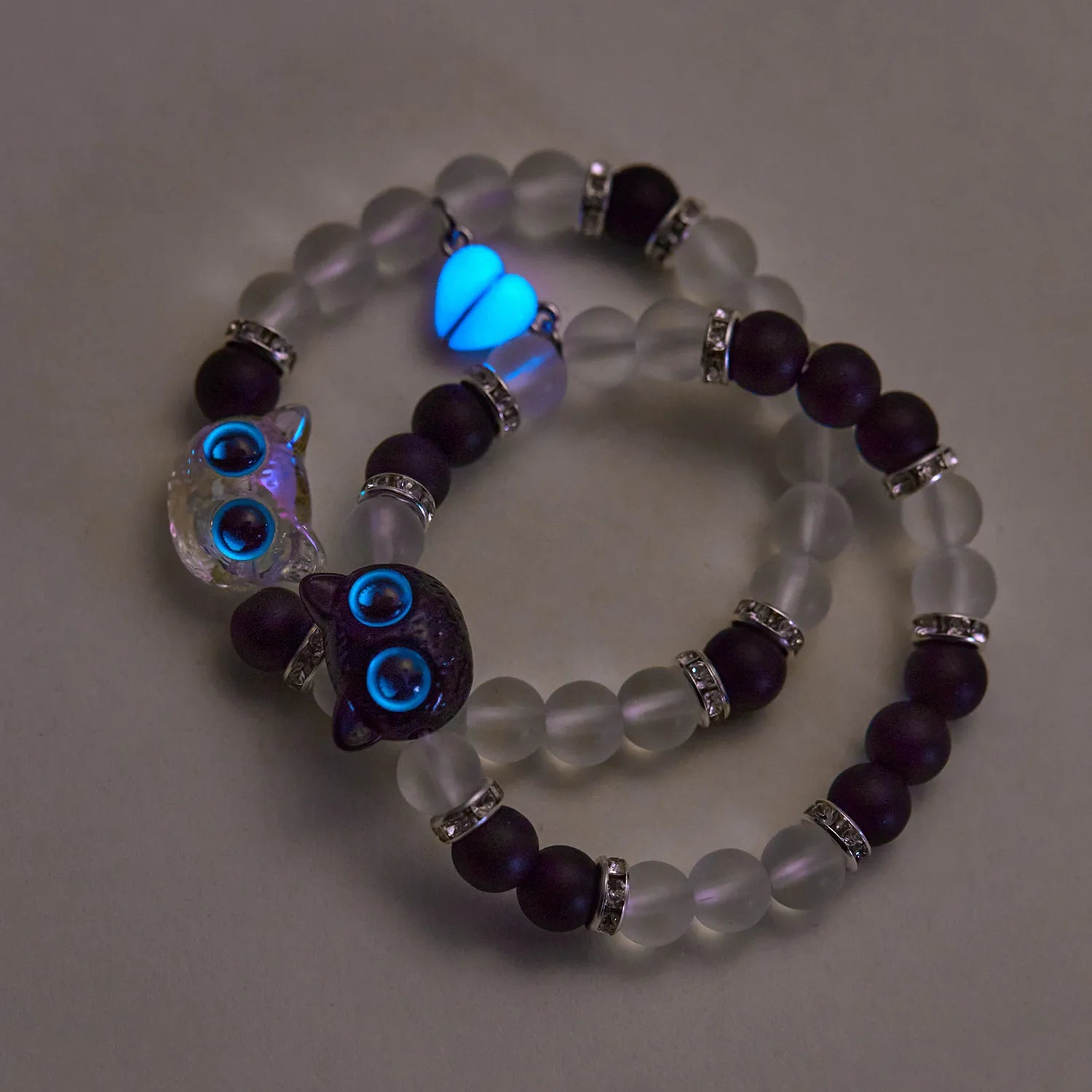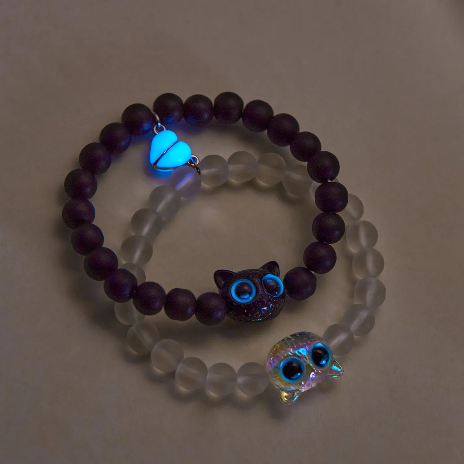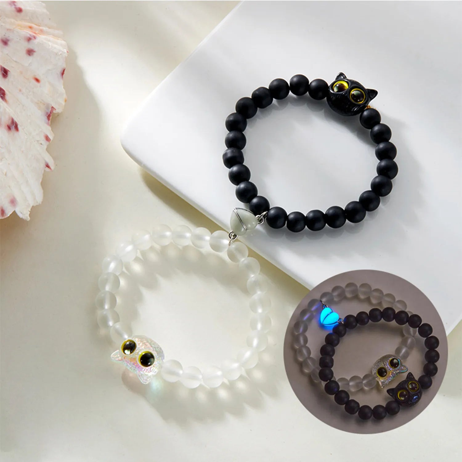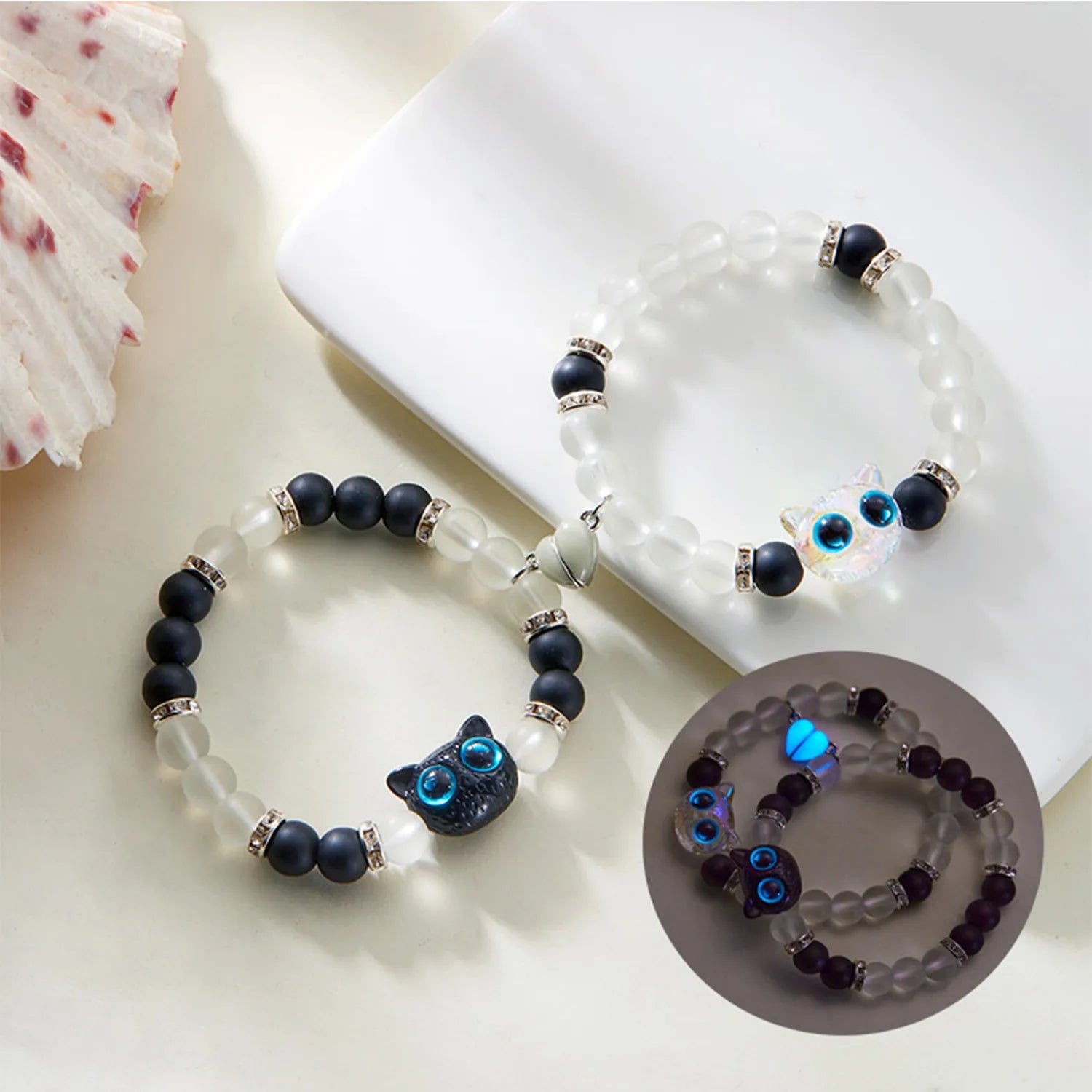 Lot de 2 Bracelets D'amitié Perles - Chat Gros Yeux Phosphoresent - Coeur Aimanté - BFF - Best Friends Forever - Amitié - Couple