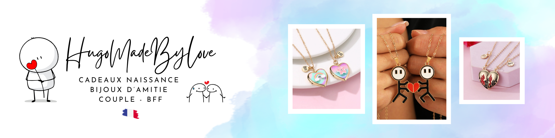 Set mit 2 Ketten, Freundschaftsketten, Herz, Regenbogenwolken – BFF, beste Freunde für immer, Liebhaber oder Paar – Fantasie – Anhänger