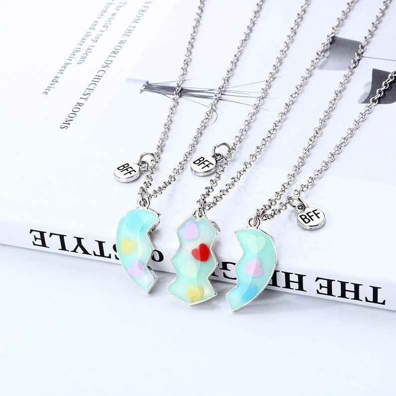 Schenken Sie Ihrem Kind und seinen besten Freunden dieses Set aus 3 Freundschaftsketten in Form eines glitzernden Herzens. Diese BFF Best Friends Forever werden sich freuen, diese süßen Magnetanhänger zu teilen. Ein perfektes Geschenk, um die Bande der Freundschaft zu stärken und ihrem Tag einen Hauch von Magie zu verleihen!