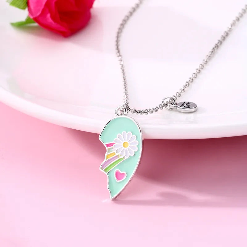 KINDER – Set mit 2 Freundschaftsketten, Herz, rosa, blau, rosa, rosa Blumen – BFF, beste Freunde für immer – Fantasie – magnetischer Anhänger