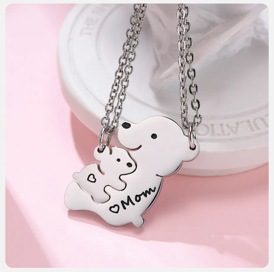 Lot de 2 Colliers - Mère Enfant - Famille Parents Enfant Maman - Pendentif Ours et Ourson à partager - Acier Inoxydable