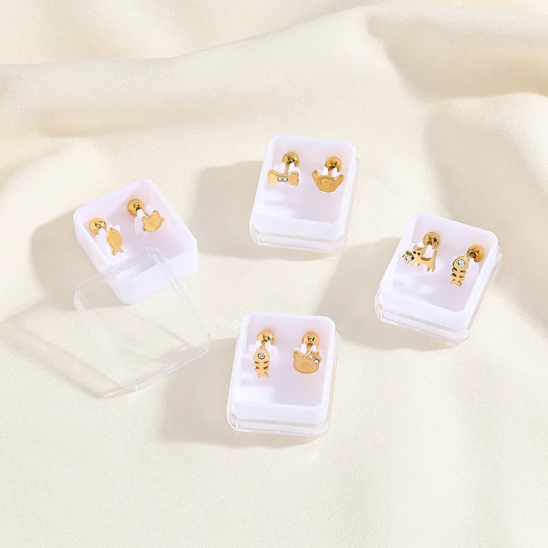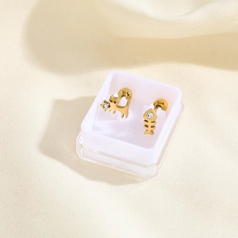 Boucles Oreilles - Chat Poisson ou Chien Os - Acier Inoxydable 304 Zircon Plaqué Or 18K - Clous d'oreilles