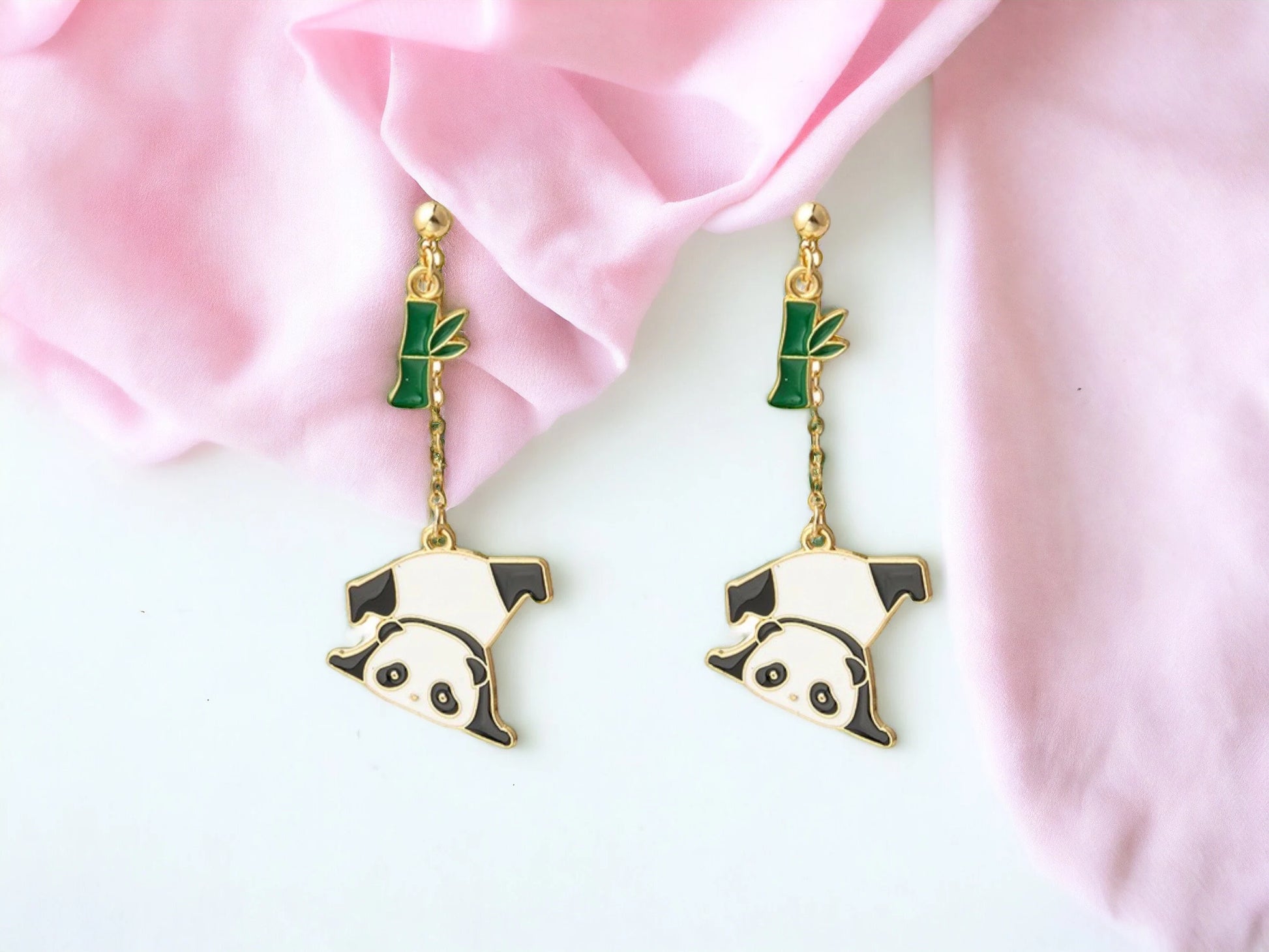 Boucles Oreilles - Pendants d'oreilles - Panda Bambou - Porte Bonheur Chance - Cuivre Plaqué Or