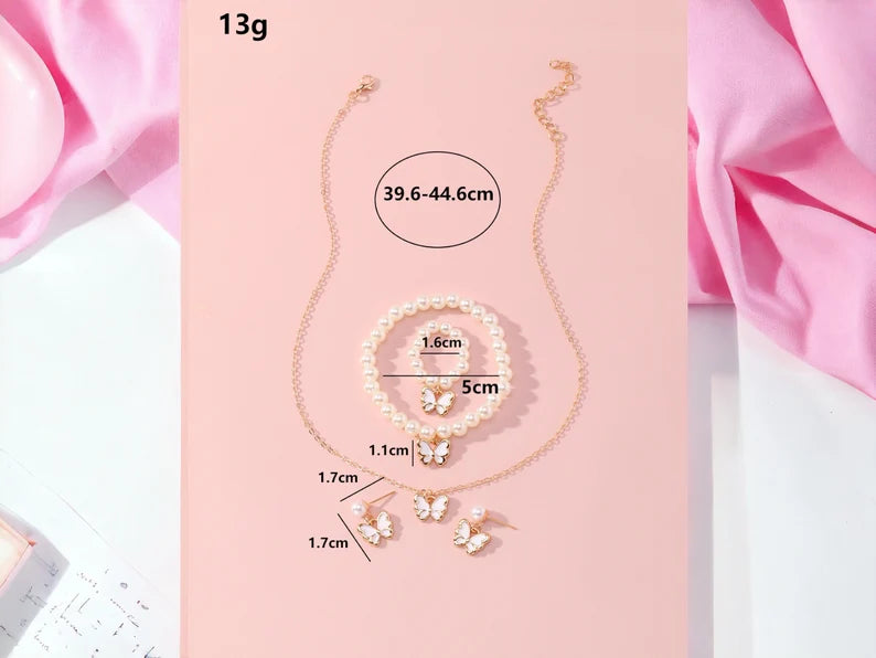 Découvrez cette magnifique parure de bijoux pour enfant ornée de délicates perles et d'un charmant motif de papillon. Idéal pour ajouter une touche de fantaisie et de mignonnerie à toutes les tenues de votre petite princesse. Faites-lui plaisir avec ce bel ensemble de boucles d'oreilles, collier, bracelet et bague qui fera briller ses yeux de bonheur!