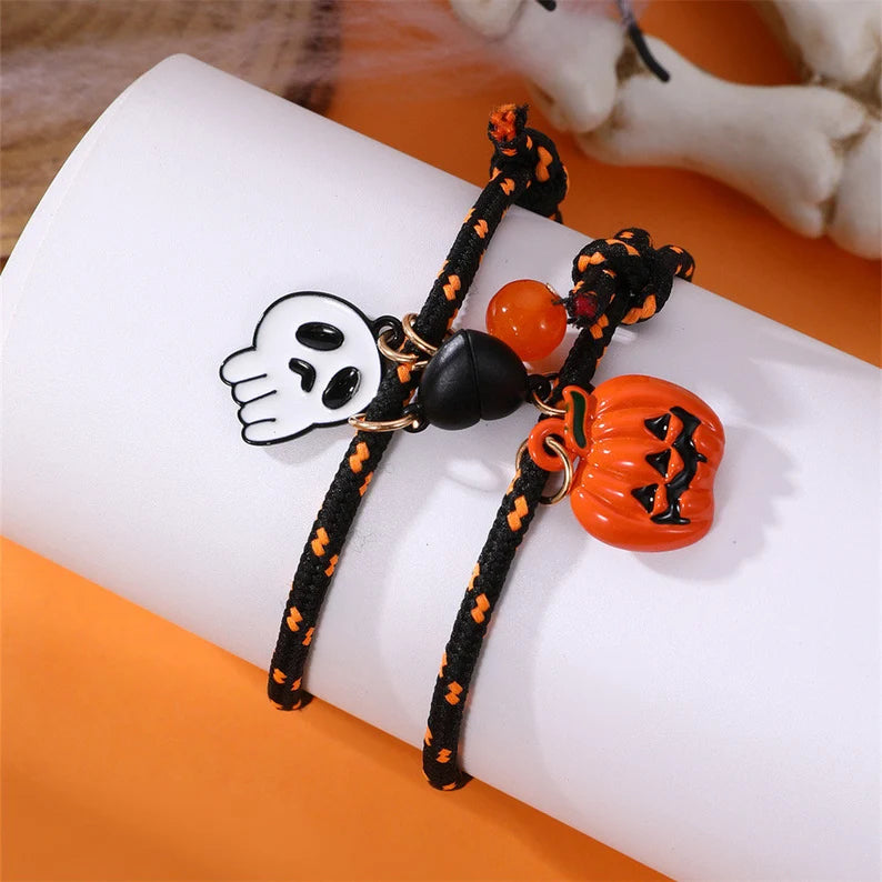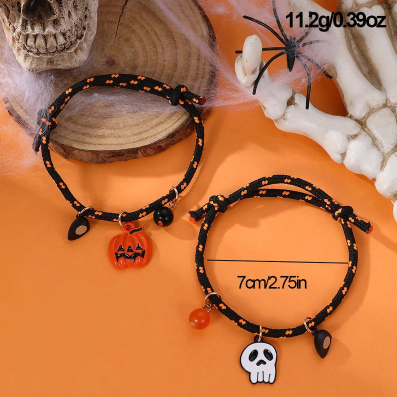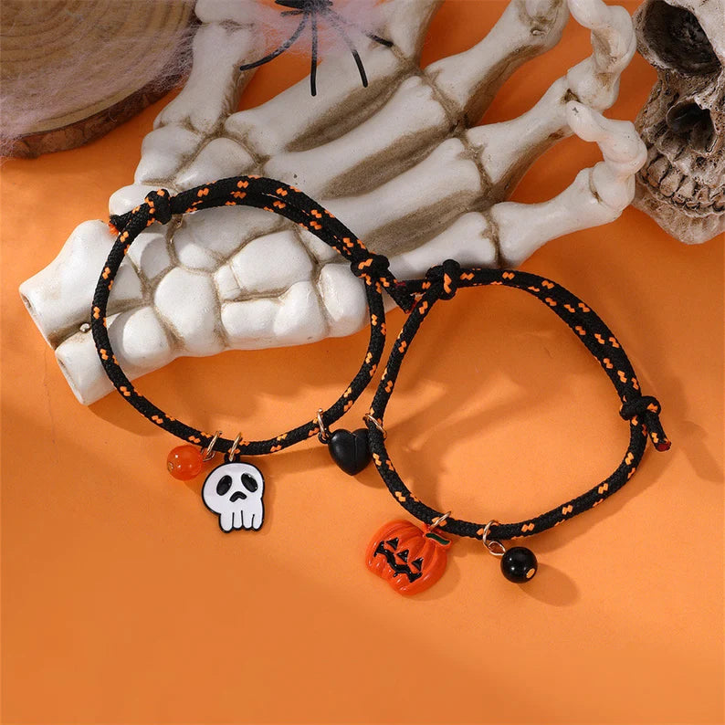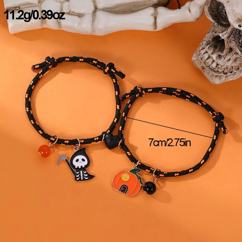 Lot de 2 Bracelets D'amitié Cordon Réglable - Faucheuse Citrouille Crane - BFF - Best Friends Forever - Pendentif Cœur Aimanté - Halloween