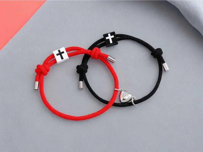 Lot de 2 Bracelets D'amitié Cordon Réglable - Croix - Best Friends Forever - BFF - Pendentif Aimanté Coeur - Amoureux Couple Amitié