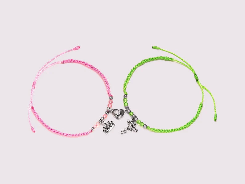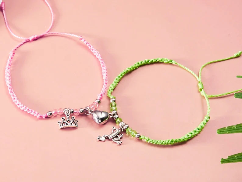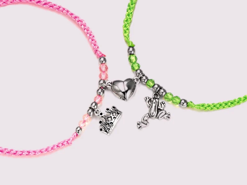 Lot de 2 Bracelets D'amitié Cordon Réglable - Coeur Aimanté - Princesse Grenouille - BFF - Best Friends Forever - Perles