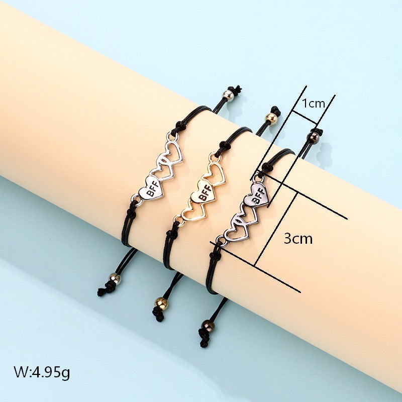 Découvrez notre Lot de 3 Bracelets Cordon Réglable d'Amitié avec Petits Cœurs, parfait pour célébrer votre lien unique avec vos meilleurs amis ! Ces bracelets fantaisie arborent de jolis pendentifs en forme de cœur, symbolisant l'amour et l'amitié éternelle. Grâce à leur design ajustable, ils conviennent à tous les poignets, offrant confort et style. Offrez-les en cadeau pour des moments inoubliables ou portez-les ensemble pour montrer au monde votre amitié indéfectible. BFF – Best Friends Forever !