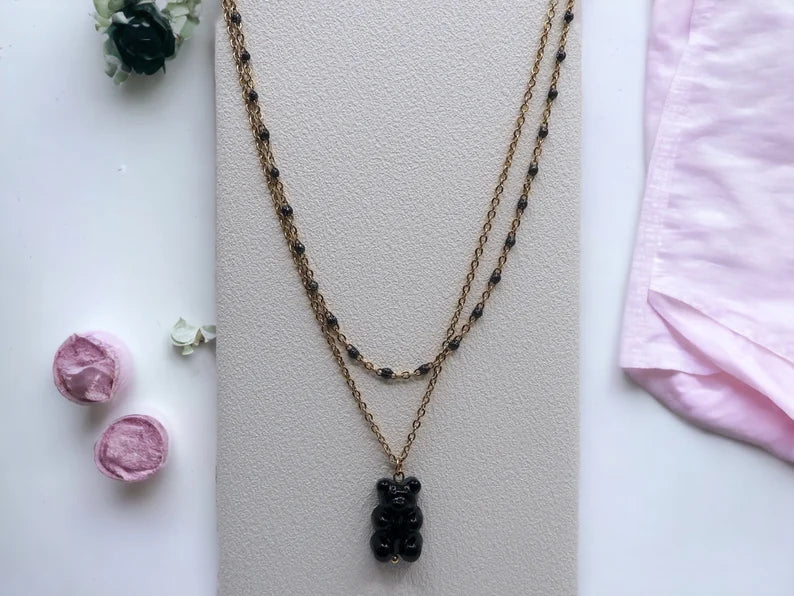 Ce collier double avec des petits oursons bonbons translucides ajoutera une touche ludique et amusante à vos tenues. Fabriqué avec de l'acier inoxydable doré, il est à la fois solide et élégant. Idéal pour les amateurs de mode avec un sens de l'humour taquin!