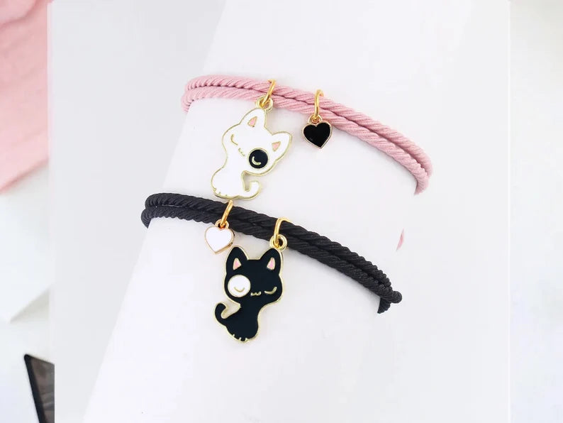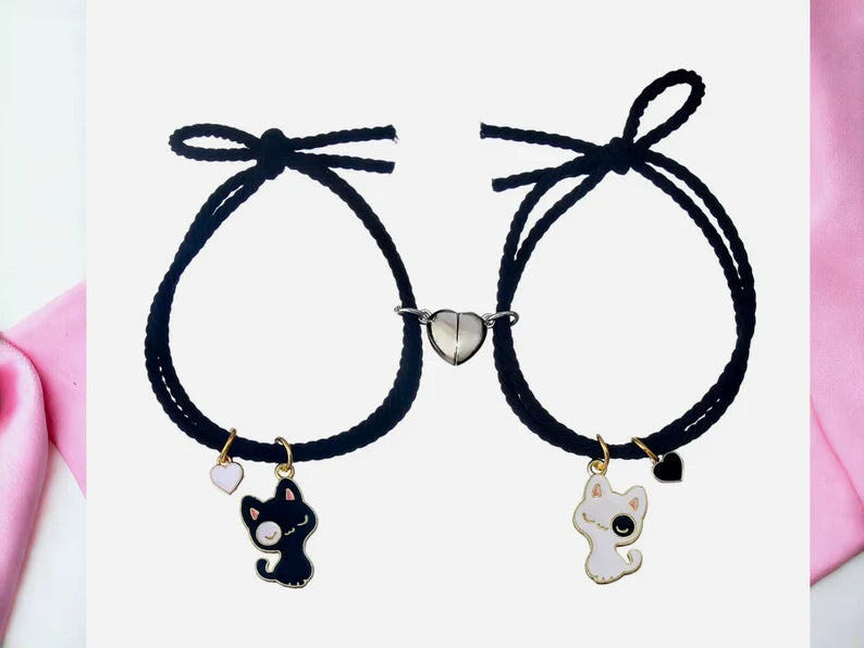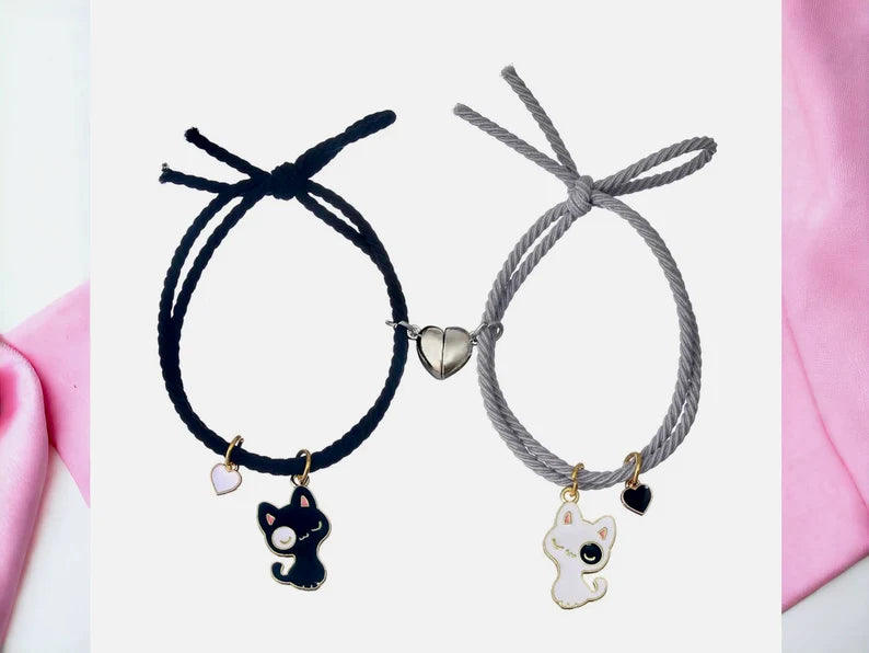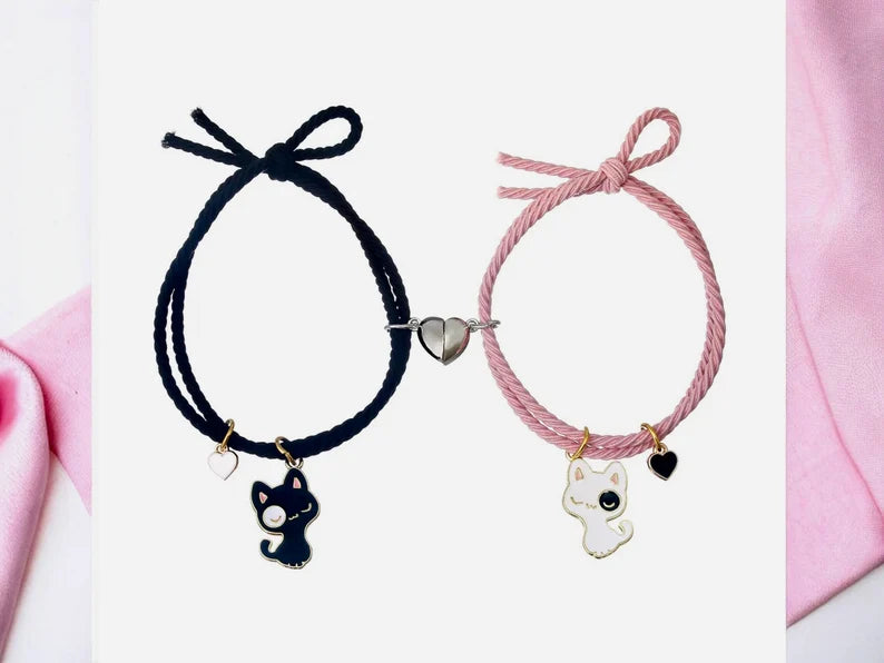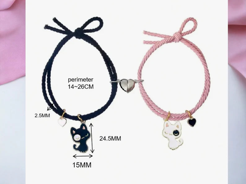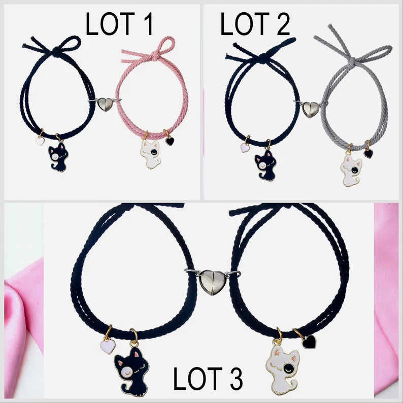 Lot de 2 Bracelets D'amitié Cordon Elastique - Petit Chat - BFF - Best Friends Forever - Fantaisie - Amitié - Pendentif Aimanté Coeur