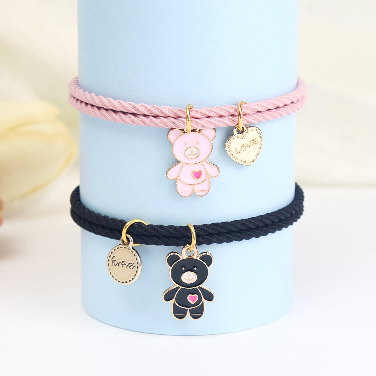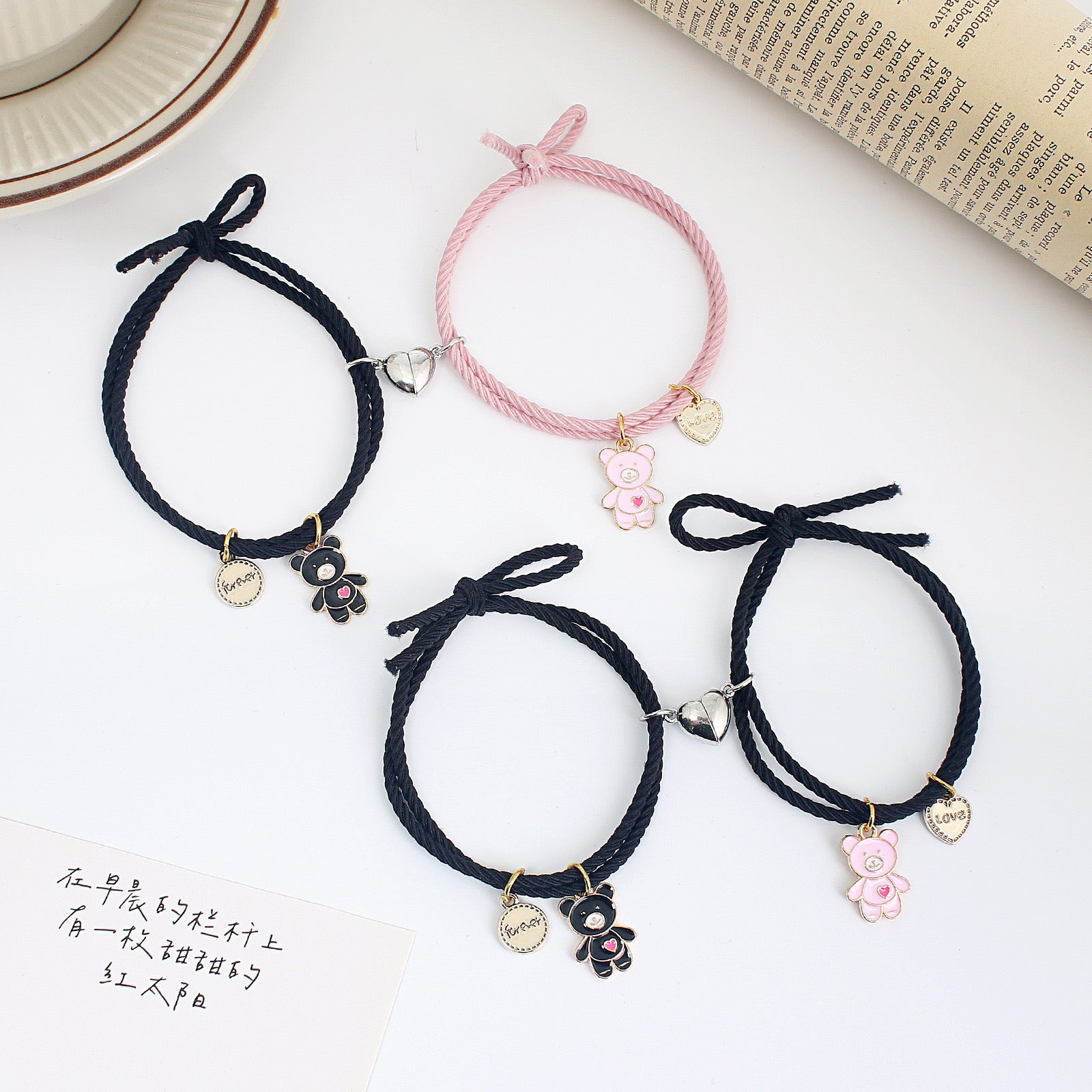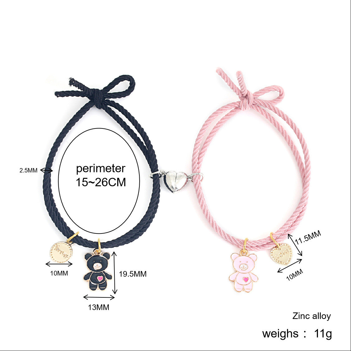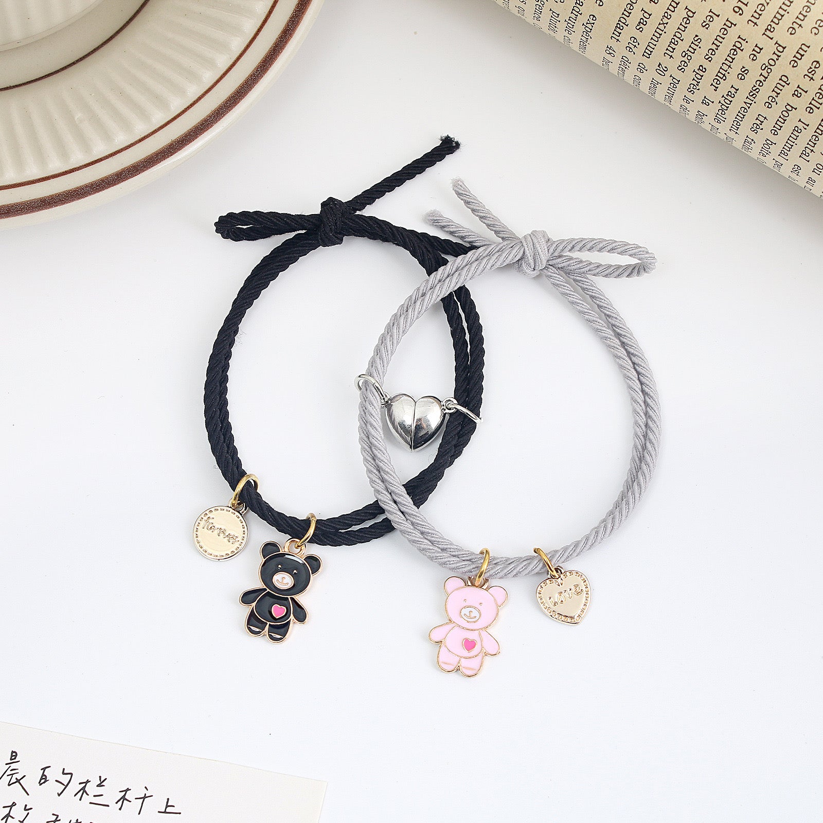 Lot de 2 Bracelets D'amitié Cordon Elastique - Petit Ourson - BFF - Best Friends Forever - Fantaisie - Pendentif Aimanté Coeur