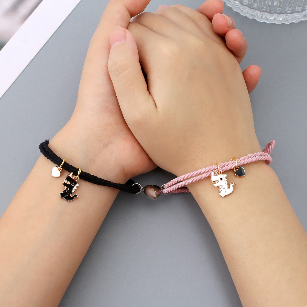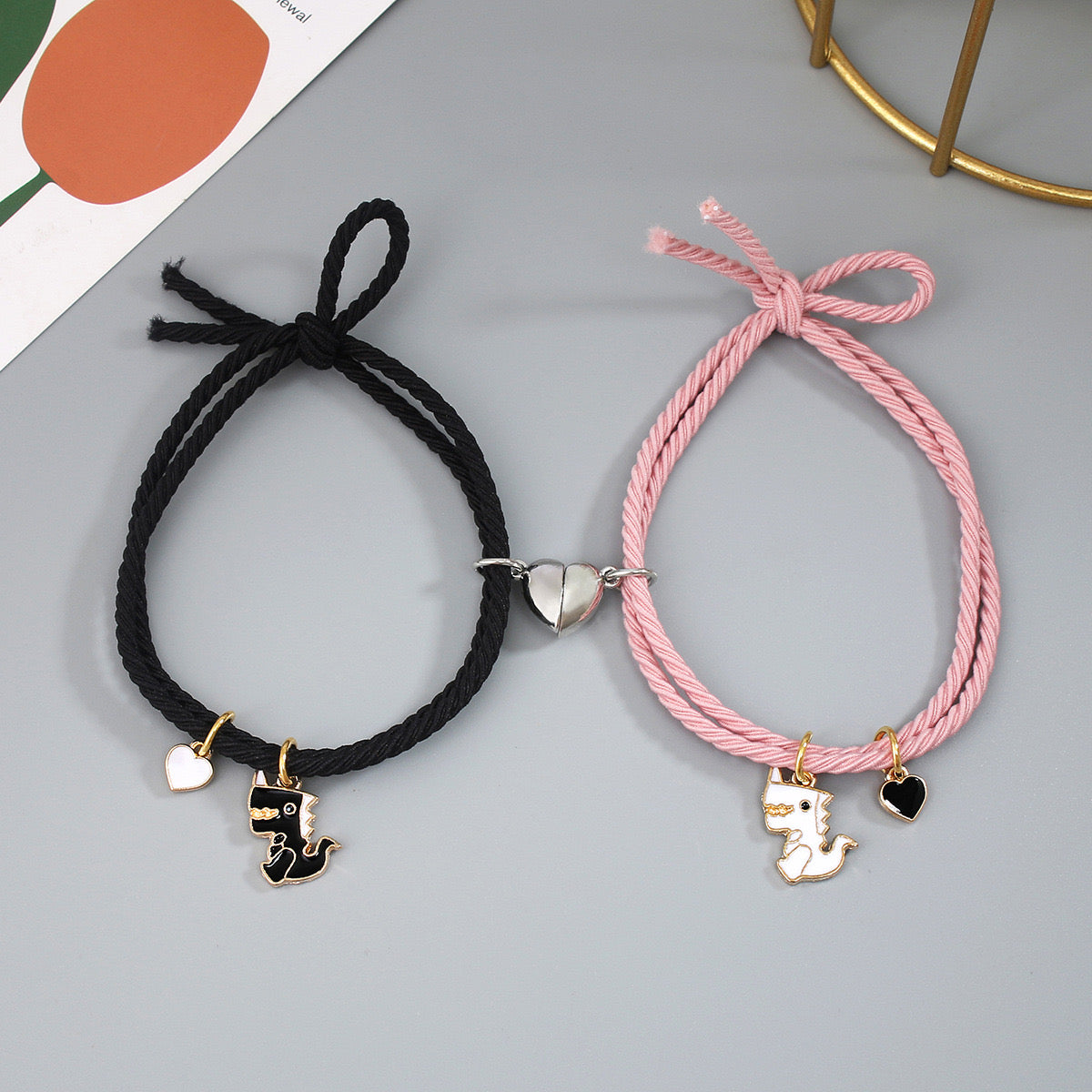 Lot de 2 Bracelets D'amitié Cordon Elastique - Dinosaure - BFF - Best Friends Forever - Amitié - Pendentif Aimanté Coeur