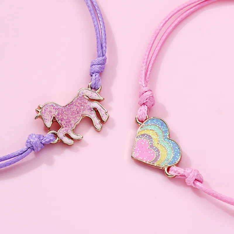 Ces 3 bracelets pour enfants sont réglables et présentent de jolis motifs de licorne, d'étoile filante et de cœur. Le cordon est de couleur pastel pour un look mignon et sucré. Parfait pour accessoiriser toutes les tenues et ajouter une touche de fantaisie à chaque journée !