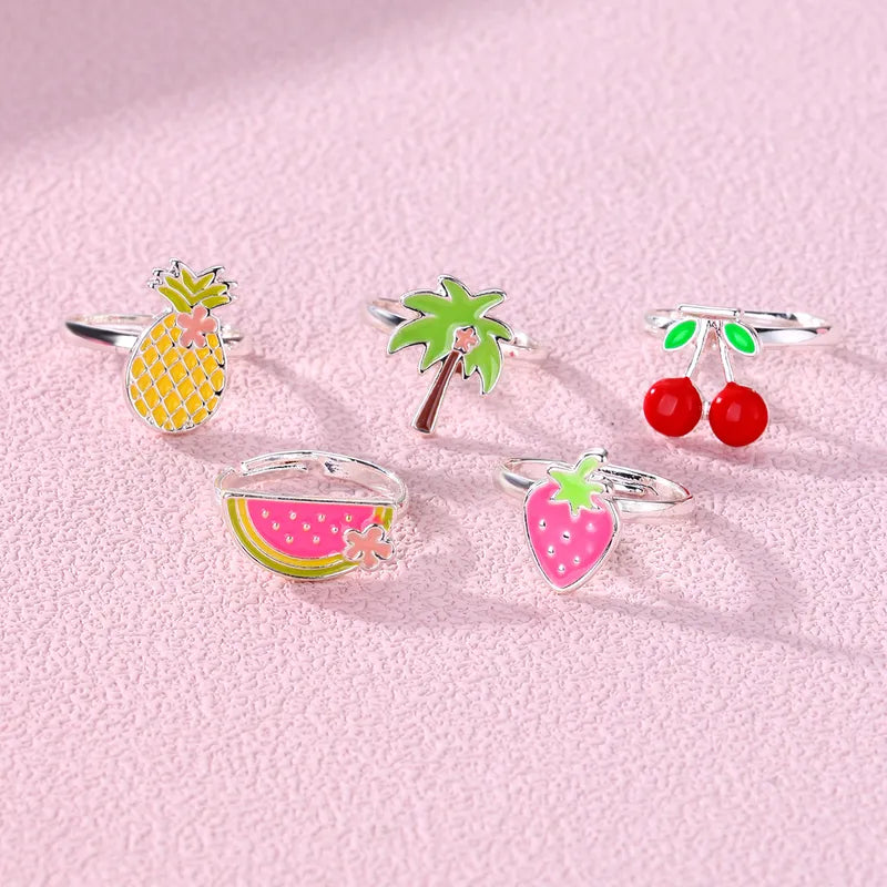LOT de 5 Bagues Réglables pour Enfants - Boite Cadeau en forme de Fraise - Fruit Pastèque Fraise Ananas Cerises Palmier - Vacances