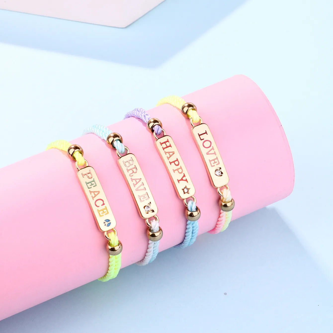 Lot de 4 Bracelets Cordon Réglable avec Carte - Love Peace Brave Happy - Mignon - Couleurs Fluo