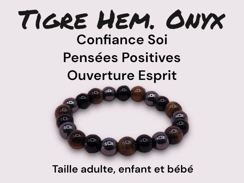 Bracelet Pierre Naturelle - Oeil du tigre Hématite Onyx - Confiance en soi Pensée Positive Ouverture d'esprit