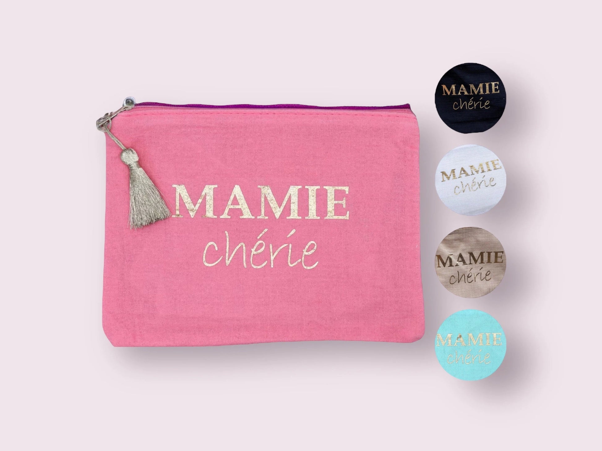 Découvrez notre pochette de maquillage ou trousse de toilette Mamie Chérie, un cadeau tendre et pratique pour les mamies adorées. Idéal comme cadeau de naissance pour les heureux grands-parents. Fabriqué avec amour pour célébrer les moments spéciaux en famille.